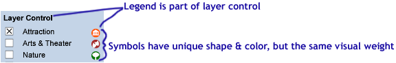 | Include the layer legend as part of the activation/deactivation method | The user can tie the activation/deactivation of layers immediately to what appears or disappears from the map. It's a strong visual cue. |