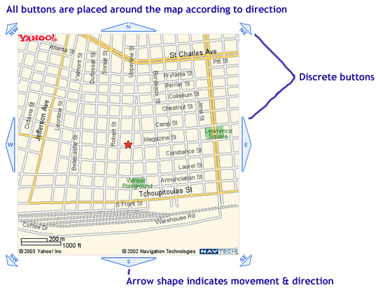 | Place the buttons around the map by direction | As the user moves around the map, if they want to pan in a direction, their eye & mouse are most likely already there. |
