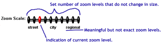 | Employ meaningful but not exact zoom levels | Levels called street, city & region are more useful than 1, 2, 3 or nothing. However, exact labeling of zoom levels creates user expectations that the technology cannot satisify. |